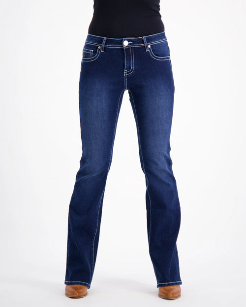 Faded indigo wash premium stretch denim jeans. Boot cut and mid rise for maximum comfort. Built and designed for the Australian Outback, these jeans have a no gap waist that is perfect for our unique environment.